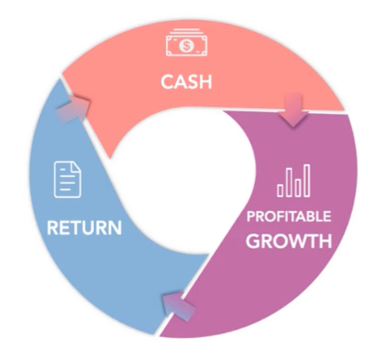 This is a final of the three parts of the outside of the Ram Charan Virtuous Business Cycle model. Where: Return creates free cash flow that fuels Cash. Cash is used directly or indirectly to fuel Growth and Profitable Growth in particular. While we can say, “Cash is qu…