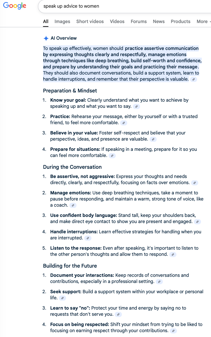 The advice to women to “speak up” is rampant. Before Google stopped counting search returns, I recorded 3,800,000,000 returns for the search “Speak Up Advice to Women.”