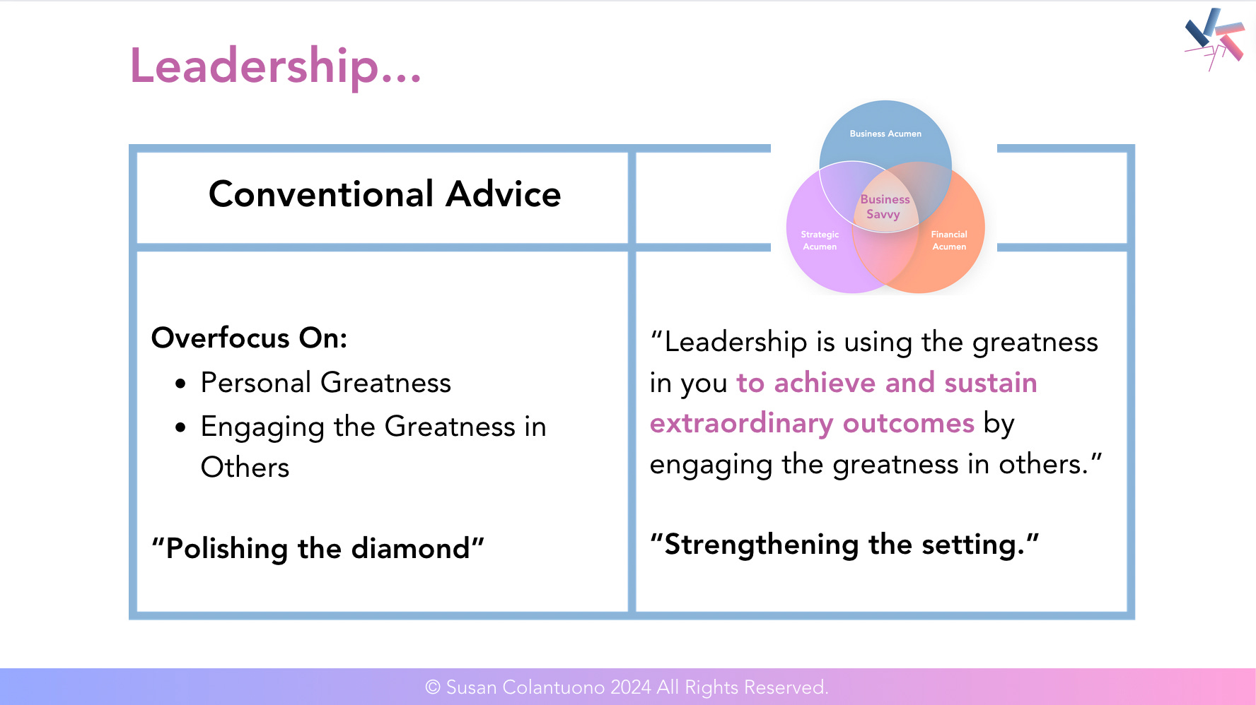 Advice, such as that from AI, most leadership programs, most coaches, most companies’ performance measures, etc., tells us to polish the diamond. When we follow that advice and double down on E and P we end up wasting time polishing the diamond. This is why so many women get stuck in middle management. We believe conventional advice, lean on our interpersonal/team skills and watch opportunities pass us by.