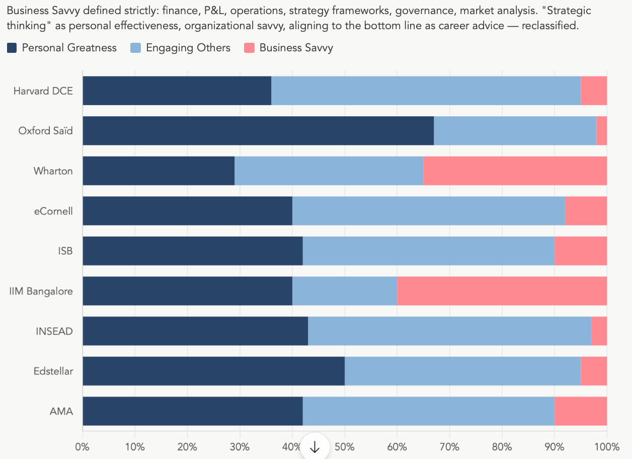 That’s why this analysis doesn’t surprise me. But seeing it mapped across programs from Harvard, Oxford, Wharton, and INSEAD in a single visual made even me pause.